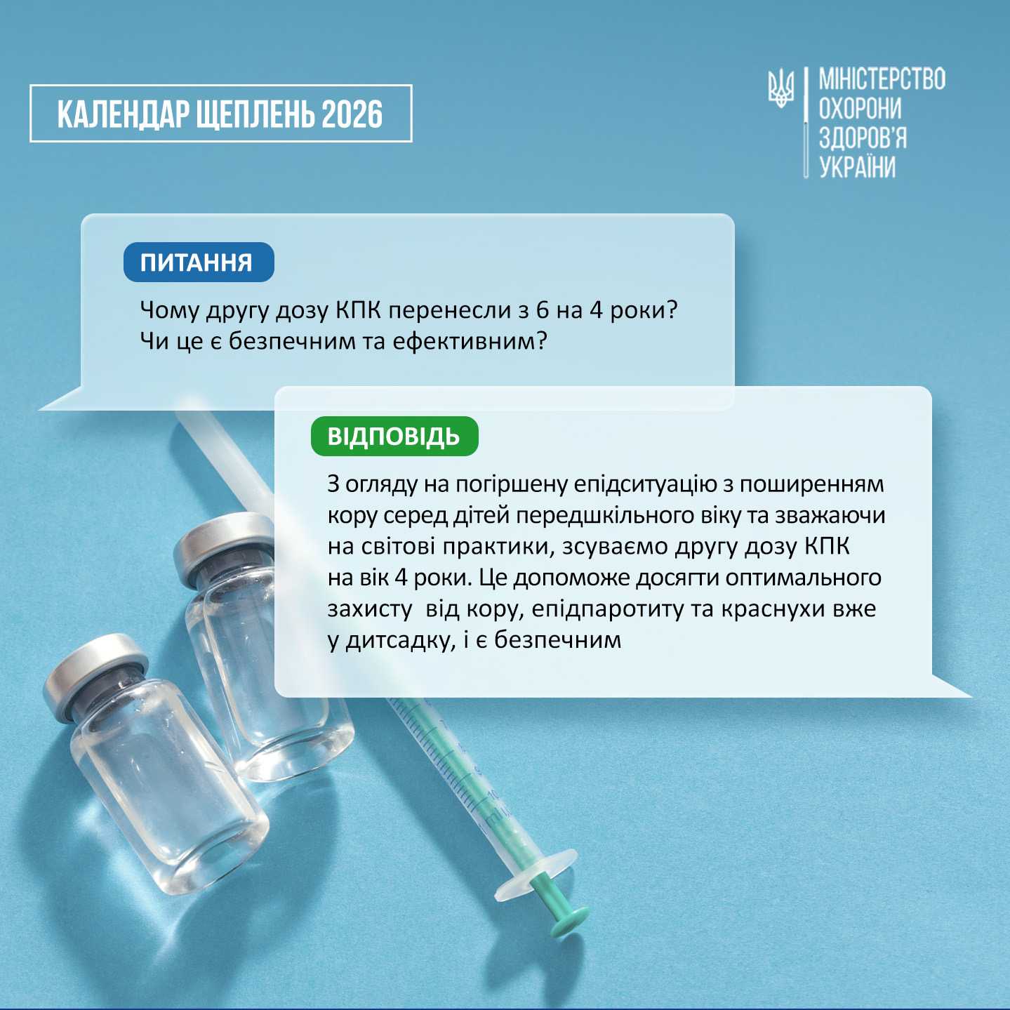 З 1 січня 2026 року набуває чинності оновлений Національний календар профілактичних щеплень. Відтоді другу дозу комплексної вакцини проти кору, епідемічного паротиту та краснухи (КПК) діти отримуватимуть не в 6 років, а в 4.